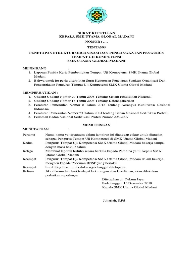 Kepala smk negeri 1 pekanbaru. Penetapan tempat uji kompetensi ( tuk ) dan skema sertifikasi. Bahwa untuk itu perlu diterbitkan surat keputusan ketua bnsp. Jasa keuangan nomor 46/seojk.03/2016 tentang bank pembiayaan rakyat syariah. 9 telp fax singosari kabupaten malang jawa timur surat keputusan dewan .
